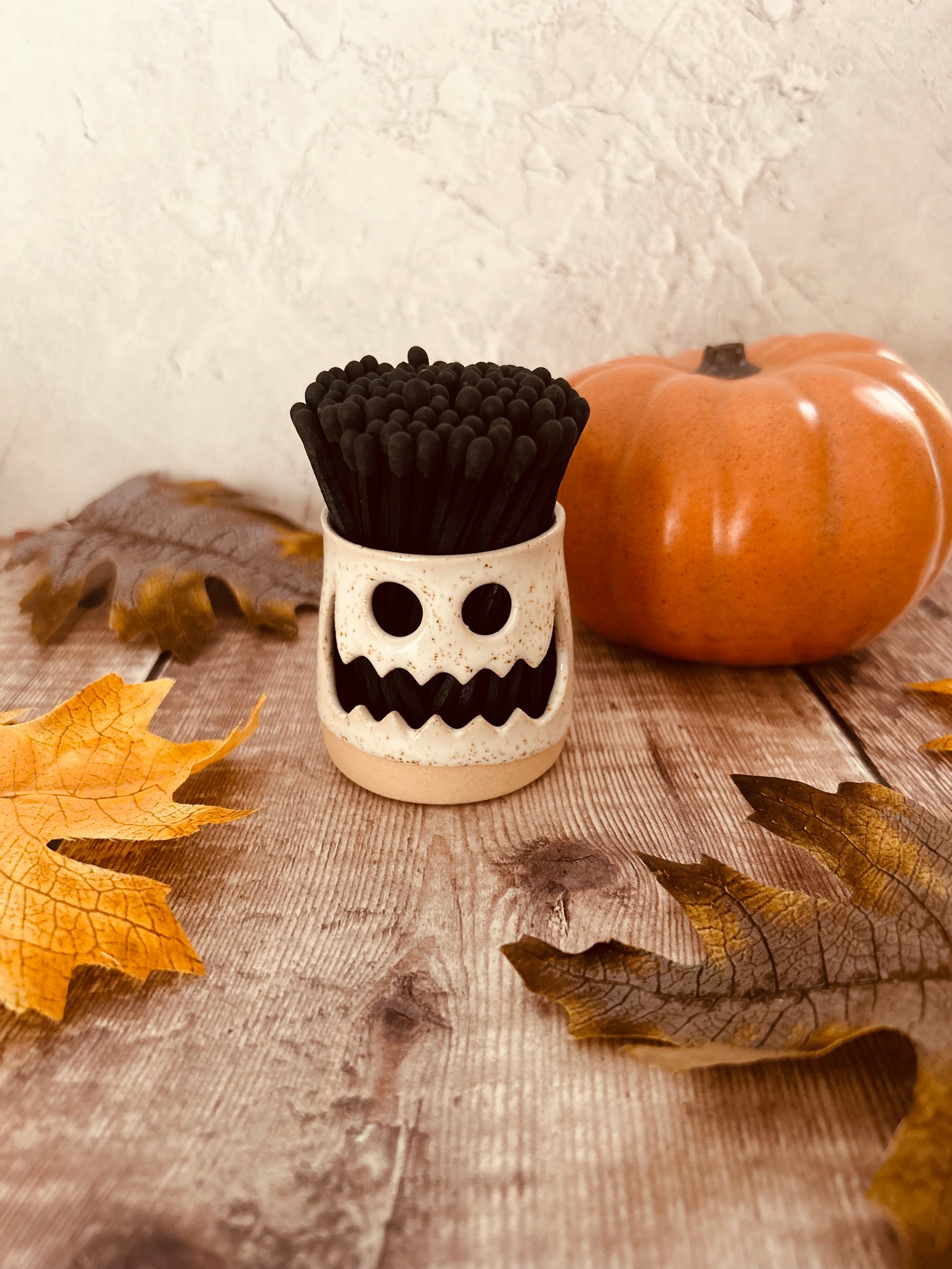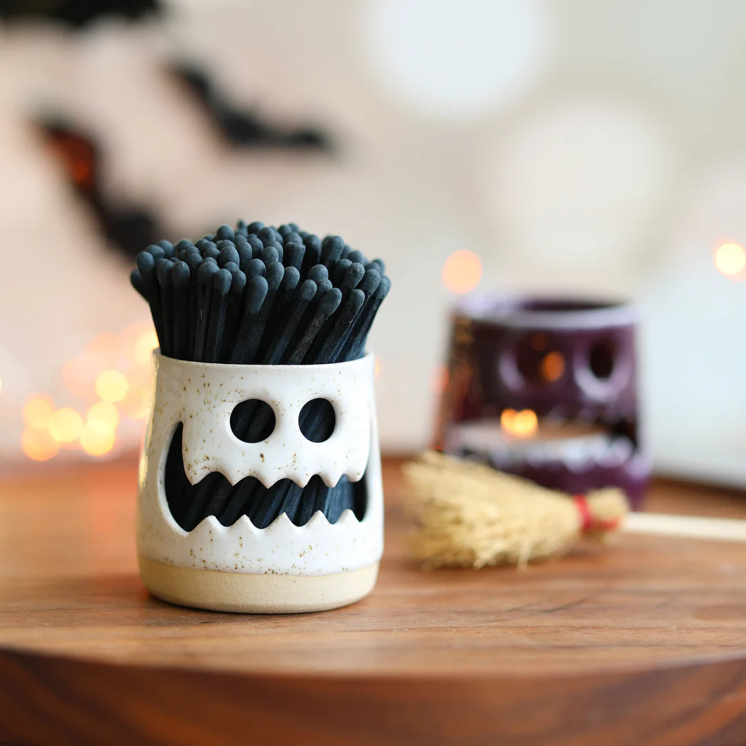 Frank(enstein) is finished in a lovely speckled white glaze and comes with black matches to create his infamous stand-up hair (we've included a striker on the base to strike your matches for use).